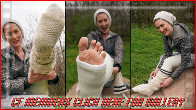 A lot of the pics in this gallery are kinda samey but that's because they're so hot I couldn't take enough pics. She pulls her pantyhose tight over her toes and off her cast. Then she takes her smelly three week old sock puts it on her casted toes.