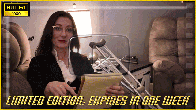 Katrina wakes up for another day of being casted with an LLC and LATS but today she's returning to work at the antique store. When her alarm goes off, she finally sits up and pulls back the blanket to reveal her black LLC covered in signatures like her LATS. She puts her cast up on a big pillow and starts looking at her phone. She tries texting her friend with one hand but eventually just tries to call instead. The friend agrees to help her carry some stuff into the store before her shift. After that, she stays in bed for a while, looking at her phone and wiggling her toes and laying on her stomach, giving an amazing view of her body in her sexy lingerie. Her cast itches and she tries scratching it with her fingers but it eventually prompts her to finally get out of bed and start the day. She grabs her crutches and heads towards the steps and then slides down to the floor while leaning against the wall so she can scoot down them on her butt. Before she reaches the bottom, she takes a break to prop her leg up and gives her toes a rub. She makes her way to the kitchen on crutches and then hops around making herself some tea. There's still a little more time before work so she has a seat and does a little reading with her leg propped up until her alarm goes off again. She forgot to bring her clothes downstairs with her so now she has to make her way all the way back up the steps on her butt. Back downstairs, she goes through the process of getting dressed and putting her shoe on. Next, it's a POV shot from the customer's perspective at her store. You walk in and find her with her leg propped up on the counter and you engage with her right away. She explains why she's in the cast and then she gets up on crutches to show you around. While she's showing you around, she sometimes stops to prop her leg up. She asks for your help a couple times, even asking you to hold her cast for her. I get the feeling you'll be shopping here again.